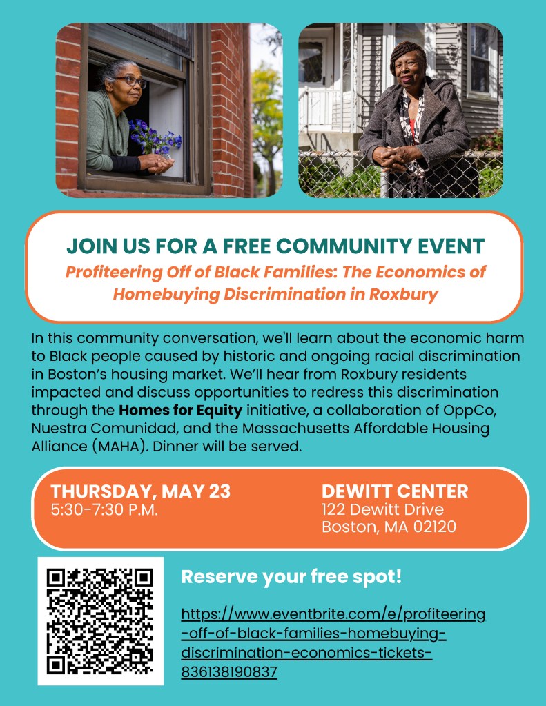 In spring 2024, Homes for Equity (HfE) hosted a two-part community conversation on housing discrimination in Roxbury with Opportunity Communities, Nuestra Comunidad Development Corporation, and the Massachusetts Affordable Housing Alliance (MAHA) at the Dewitt Center. HfE is a pilot project to build wealth through homeownership for Black people who have experienced housing discrimination. It focuses on two areas key to restorative homeownership: financing and policy changes that allow explicit race-conscious marketing and buyer selection, and greater home equity appreciation to build wealth among buyers of color.